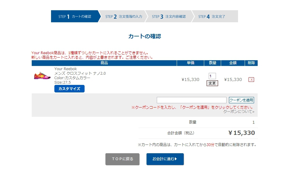 カスタマイズシューズには適用できないようでちょっと残念。