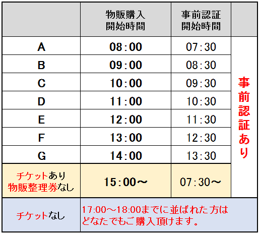 新)チケット あり / 物販整理券 なし 15:00~(物販) 07:30~(事前認証)