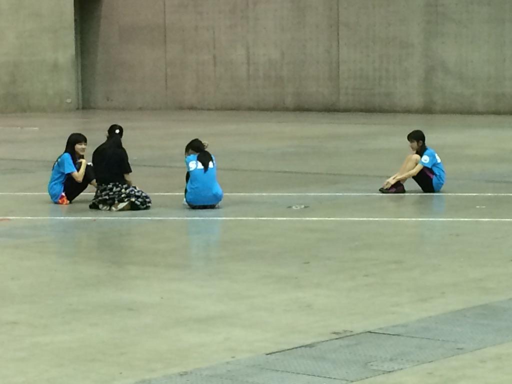 これはどんたくのリハーサルで東京に行った時の写真。左から理子・れに・夏希・さくらです。それぞれの立ち位置に着いたまま確認待ちになり、側にいたれにがメンバーに話しかけてくれました。さくらはこの後輪に入りましたよ、写真撮ってないですけどね。なんの話をしていたかは知りませんがw(所長)