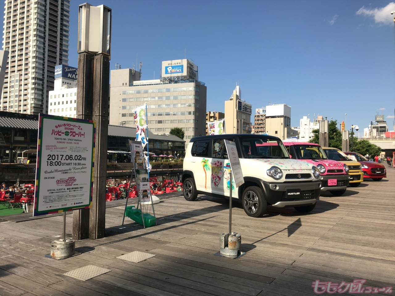 今日のハピクロ公開収録は大阪・湊町リバープレイスで行われましたが、その名の通り川沿いにあるデッキスペースにSUZUKI車両が展示されていました。