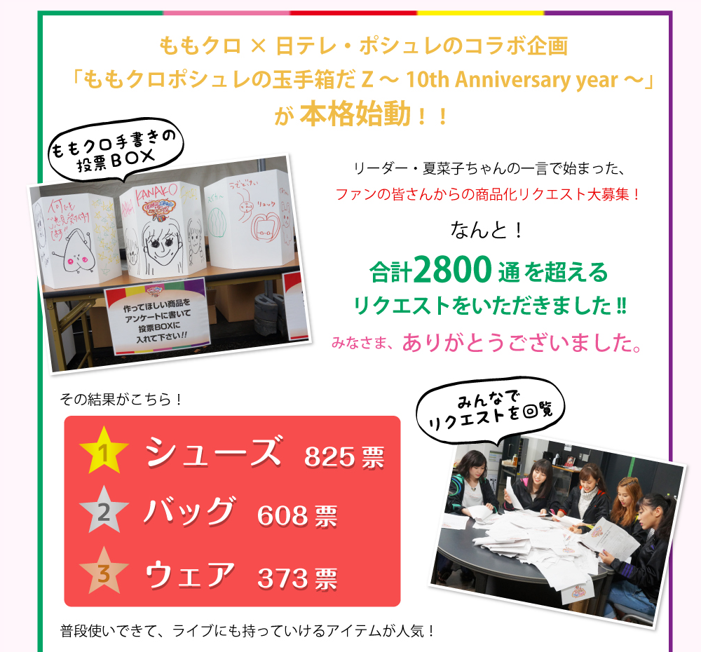 商品化リクエストの結果、1位はシューズ、2位はバッグに決定!