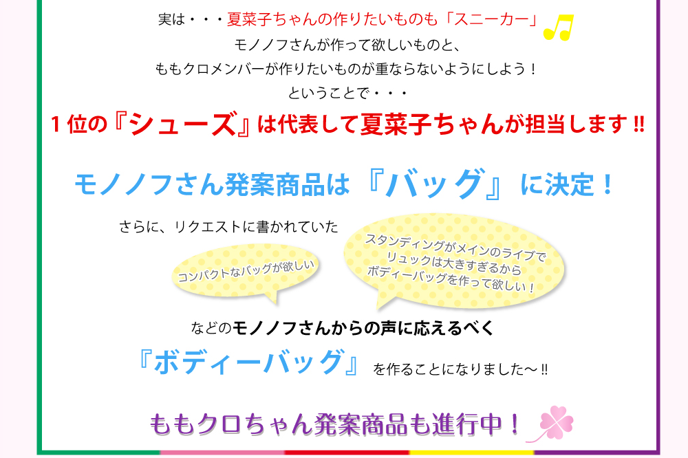 1位のシューズはリーダー百田夏菜子担当で開発決定。