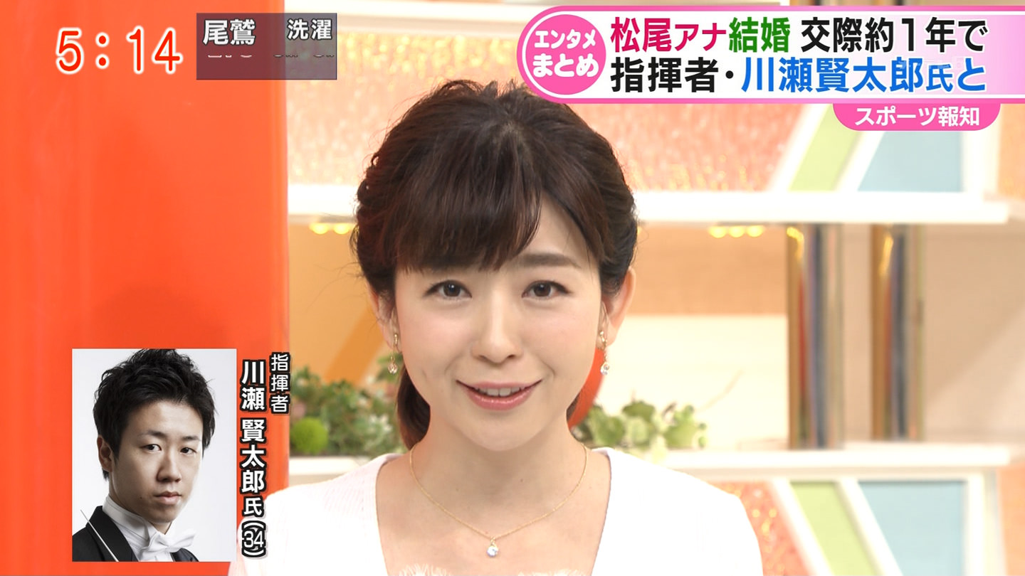 28日の「グッド!モーニグ」の生放送で松尾アナ「私事でこんなお時間頂いて恐縮なんですが、ご報告させてください。このたび結婚いたしました」と報告し、相手の川瀬氏について「自然体で許してくれる人」と紹介。川瀬氏が飼っていたネコを「出張した時に預かったのがきっかけで、ネコが縁をつないでくれてとんとん拍子にことが進んで今に至ります」と話した。