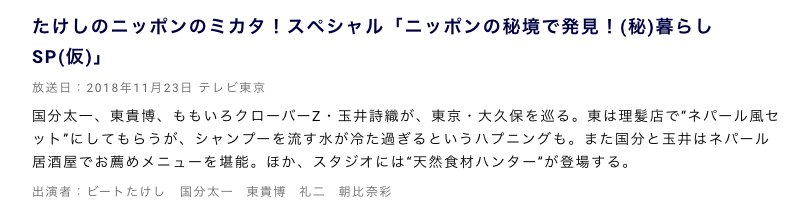これに「国分太一、東貴博、玉井詩織が、東京・大久保を巡る。また国分と玉井はネパール居酒屋でお薦めメニューを堪能。」とあることから10月30日の玉井詩織ロケ目撃情報はニッポンのミカタ!ロケであることが確定しましたw