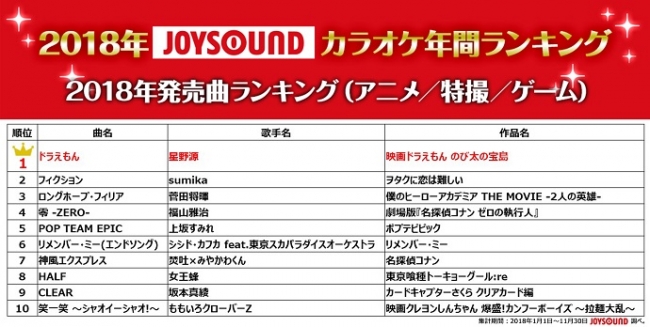 □業界最多の曲数を誇るJOYSOUNDが、2018年カラオケ年間ランキングを発表!|株式会社エクシングのプレスリリース